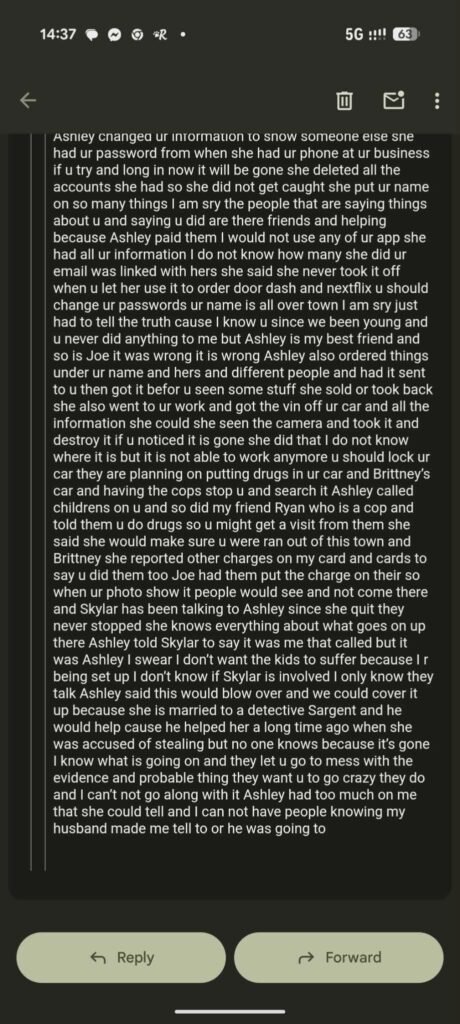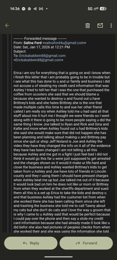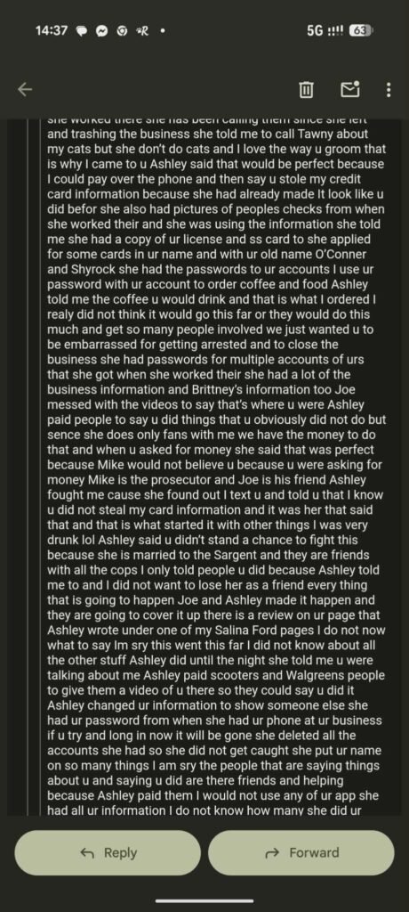 MOFreePress also obtained a verified email written by the alleged victim, who used the name Salina Ford, an alias the individual has also used publicly on social media. In the email, Ford claims the fraud allegations were part of a coordinated “frame job” organized by a former Nudles on the Growl employee, Ashley Kenney, and her husband, Lincoln County Deputy Joe Kenney. The email appears emotionally charged and has been subjected to AI-assisted authorship analysis, which indicated with greater than 90 percent confidence that the message was authentically written by the alleged victim.